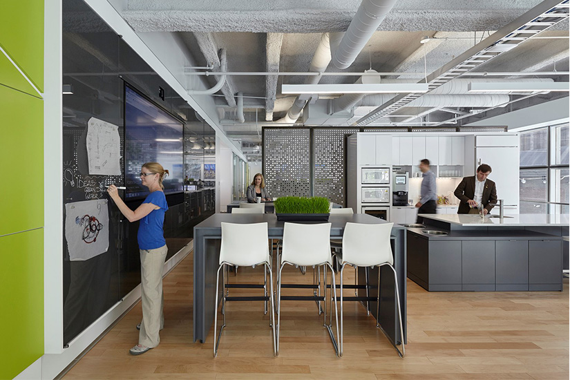 As a design firm, RATIO Design wanted collaborative spaces that encouraged creativity and drawing with products such as the Formica® Specialty Markerboard with magnetic dry erase panels. The additional benefit of having these types of panels allowed them to blend in as walls when not being used. The magnetic dry erase panels facing the open office area are used for general announcements – such as “Yoga tonight at 5:00,” brackets during Basketball finals, and other social gathering messages. The Formica® Specialty Markerboards are used constantly for designers personal use while allowing the firm to stay on top of work, as well as communicating with one another.